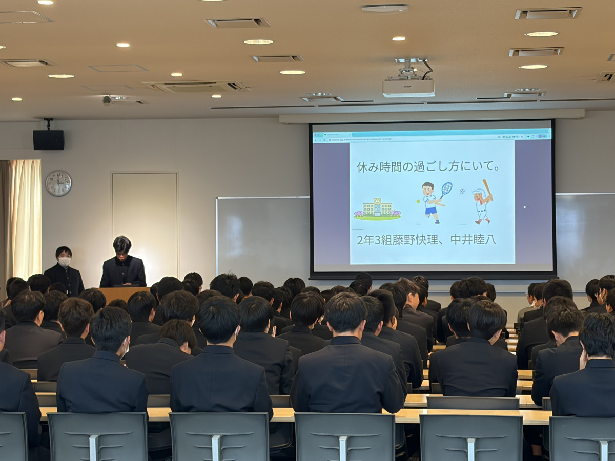 中学校集会で、各クラスの学級委員が、学校生活についてのプレゼンテーションを行いました。